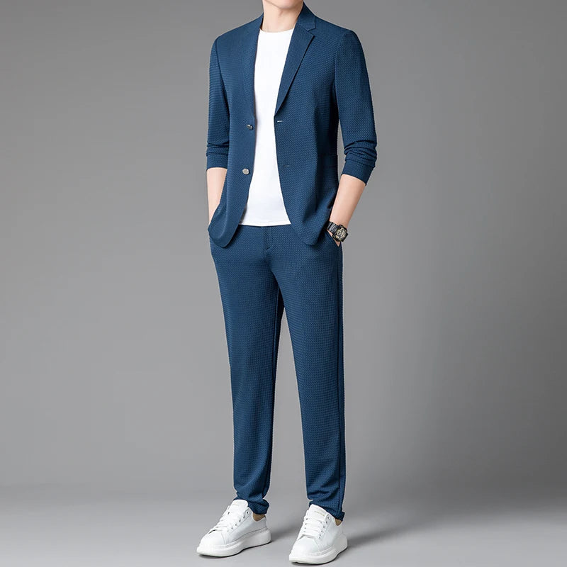 Corte slim fit que valoriza a silhueta masculina, oferecendo uma modelagem ajustada sem limitar os movimentos. Ombros estruturados e cintura ajustada para criar um visual afiado e moderno.
