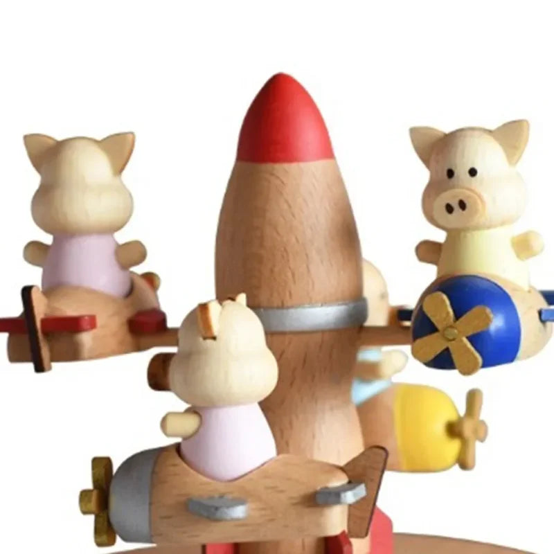 O carrossel possui um mecanismo mecânico que, ao ser girado manualmente, reproduz uma melodia suave sem necessidade de pilhas ou energia elétrica. É fácil de ativar e seguro para crianças.