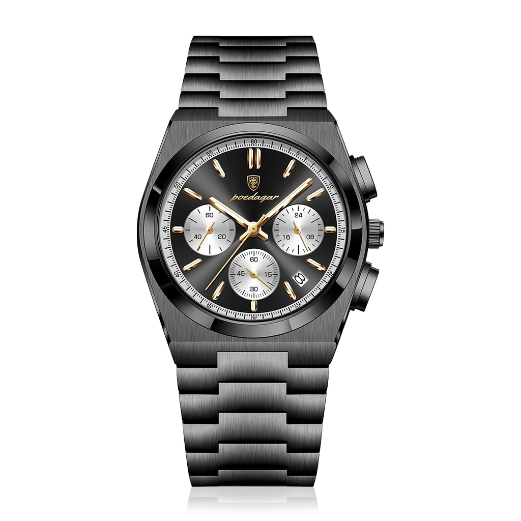 Construído inteiramente em Aço inox 904L com mostrador em vidro de Safira