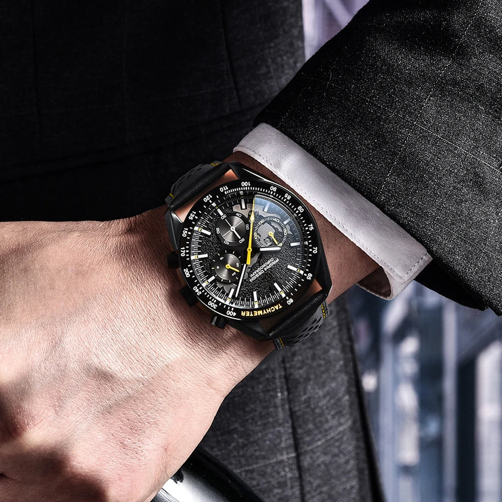 Equipado com um movimento de quartzo VK63 importado, o Moon Watch garante precisão e estabilidade incomparáveis. Seu cronógrafo funcional permite que você acompanhe o tempo com exatidão, enquanto a bateria de longa duração, que varia entre 2 a 3 anos, assegura que você não precise se preocupar com trocas frequentes.