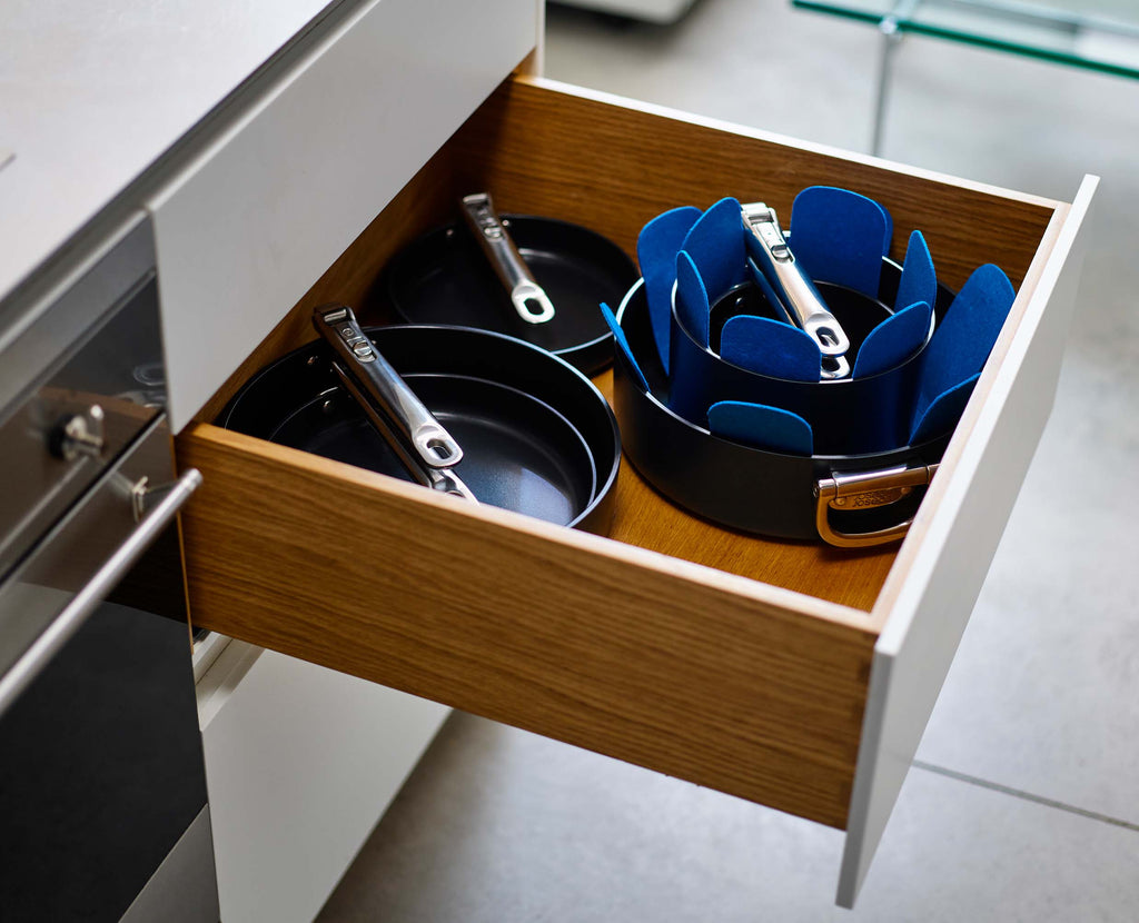 Economize até 50% de espaço nos armários com cabos rebatíveis em aço inox, testados para resistir a mais de 20 anos de uso diário. -